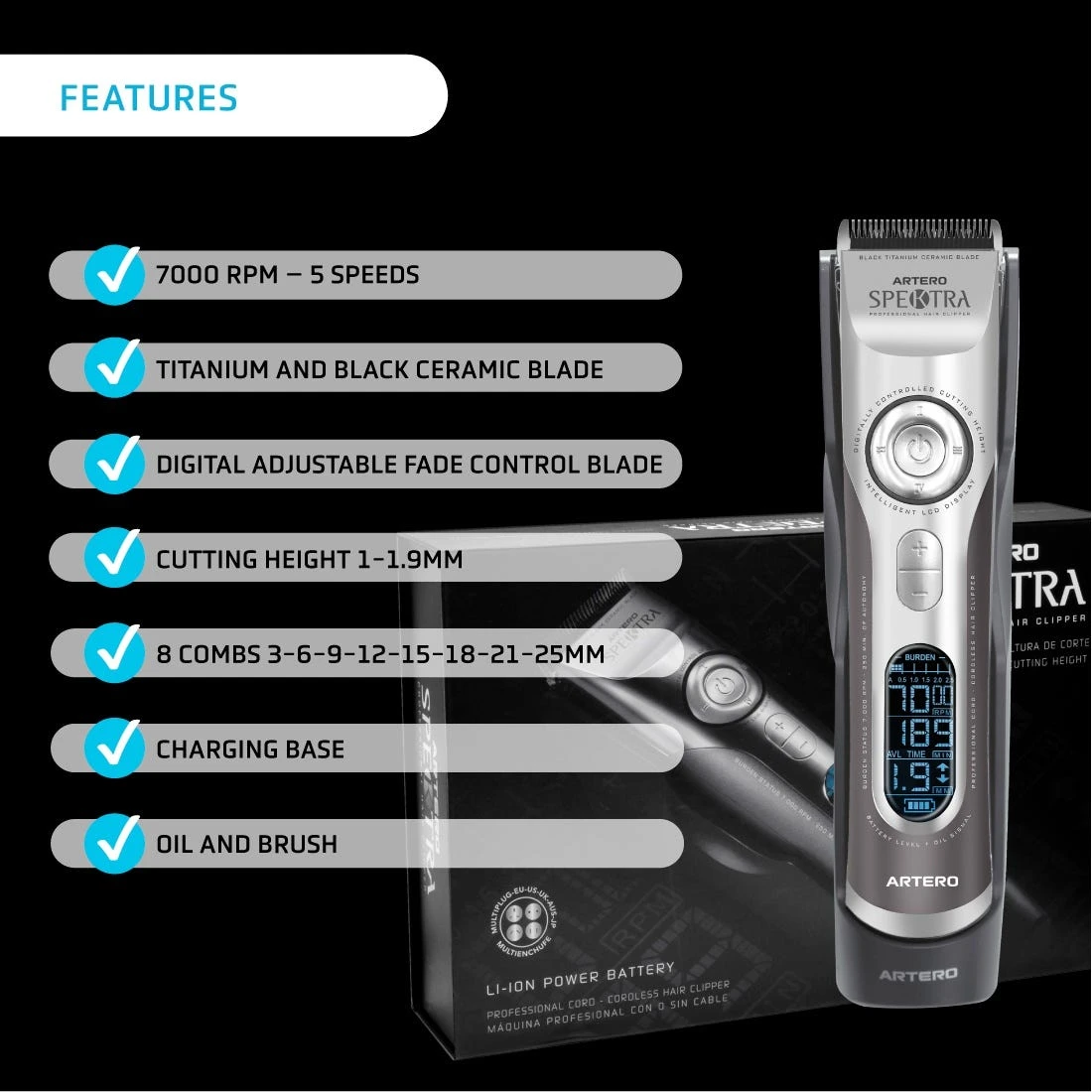 Artero® Spektra 5-speed Cordless Clipper features easy-to-read digital interface and 5-speed control for the ultimate ease of use. 4-in-1 sleek black ceramic blade, digitally adjusted cutting length control. Facilitates smooth fades. Use corded for all day trimming or cordless to reach tough spots with ease. Speed ranges between 5,000 to 7,000 rpm for versatile clipping. 4-hour Lithium-Ion battery life for extended grooming. Includes 4 guard comb attachments, lubricating oil, 4 in 1 blade, charging base, cleaning brush, battery, and electrical plug with adapter for all countries.