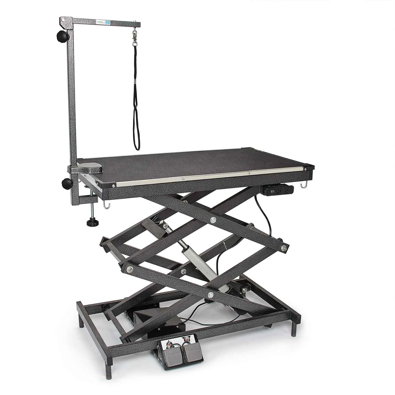 Master Equipment® X-Tend Delux Electric Grooming Table is a professional-duty versatile table designed for the professional groomer. Powerful lift capacity of 220 lbs means this table can handle the big dogs! Table height is adjustable from 11″ (without Grooming arm attached, 21″ with Arm attached) to 48.5″ eliminating the need to pick up large dogs and the max height means you can groom the little dogs at a comfortable height. Two USB outlets for charging or USB tools and two electrical outlets for corded clippers and dryers keep the floors clear and safe around the table. Convenient hooks for hanging tools so you can keep your table top clear. Levelers on all four legs keep table steady on uneven floors. Convenient dual foot pedal control to raise and lower the table. 41″ x 24″ top. Includes Grooming arm with clamp and Grooming loop.