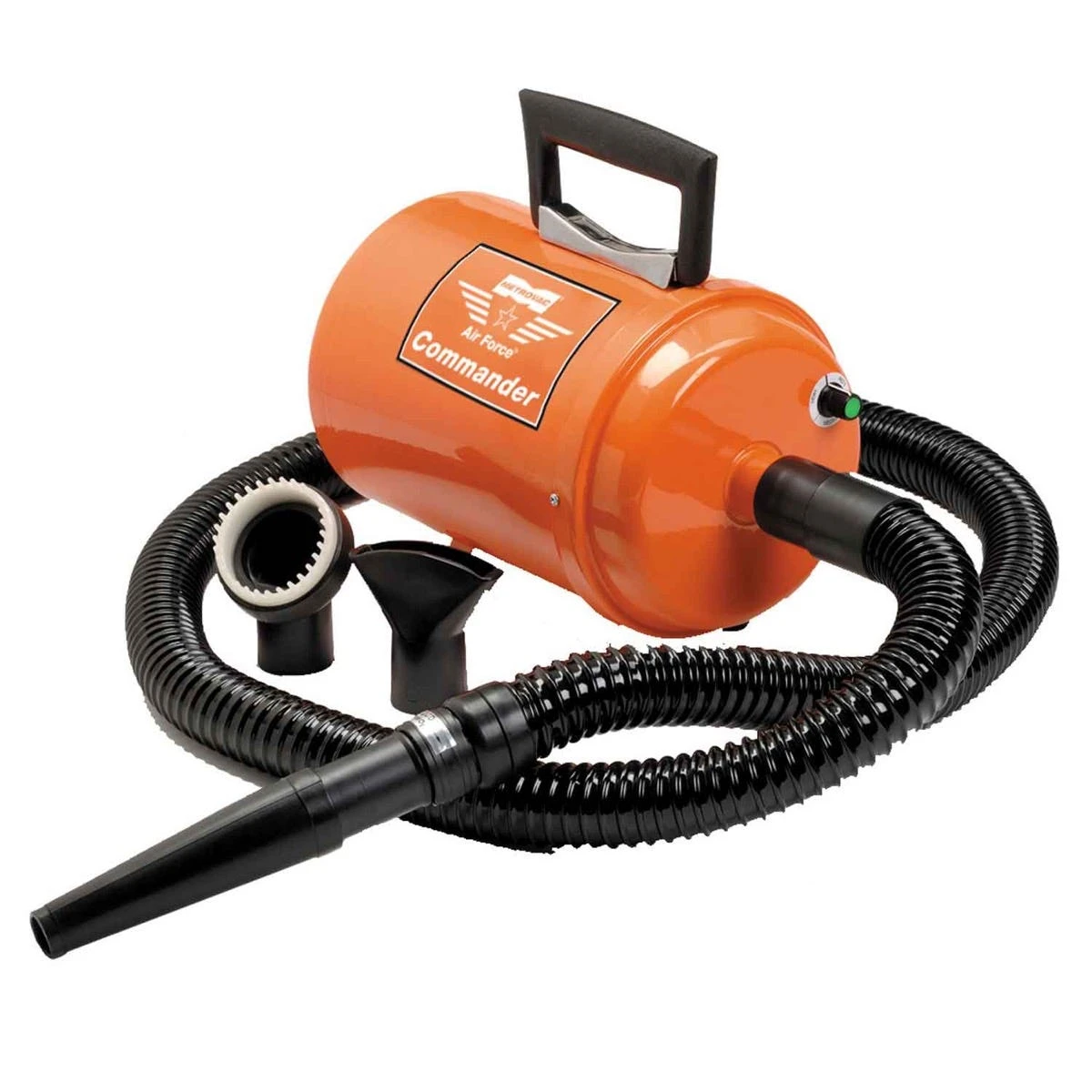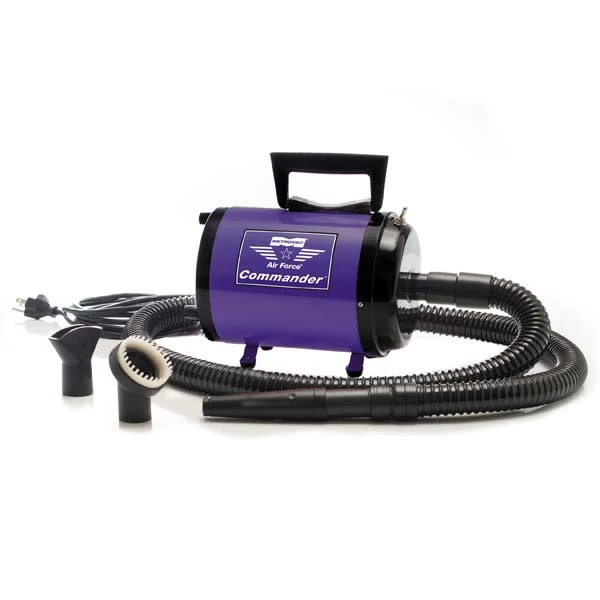 Powerful Air ForceĀ® CommanderĀ® Vari-Speed Dryers from Metro are lightweight and portable for shop or mobile use. They use a warm stream of air to effectively blow water from the dogās coat to cut drying time in half.